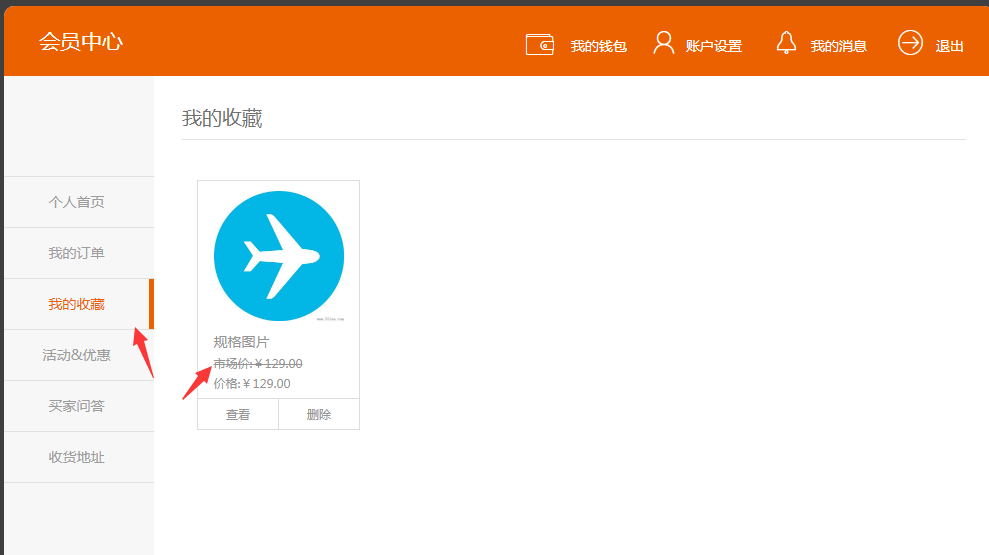 ③.此外,在会员中心可以查看收藏的商品