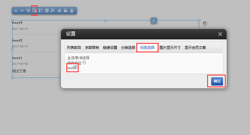 4,前台-文章列表-设置-标签选择,可以通过标签来控制文章列表的显示。